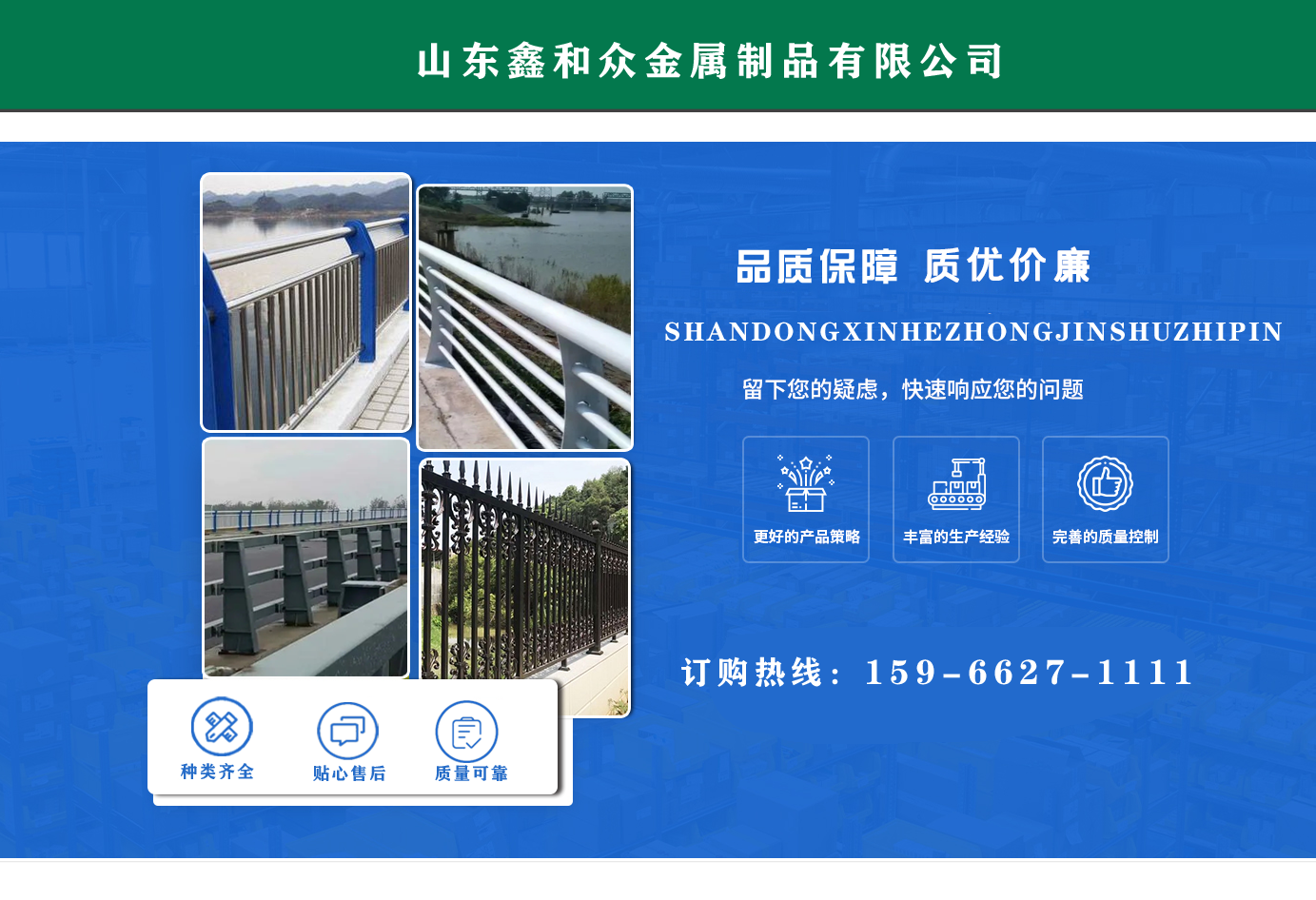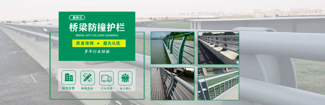 山東鑫和眾金屬制品有限公司主要產(chǎn)品有防撞護(hù)欄,橋梁護(hù)欄,道路護(hù)欄,河道護(hù)欄,不銹鋼護(hù)欄等護(hù)欄。提供設(shè)計(jì)方案,一站式定制,包您滿意價(jià)格優(yōu)惠,歡迎來電咨詢!    公司常年從事銷售護(hù)欄防撞護(hù)欄,橋梁護(hù)欄,道路護(hù)欄,河道護(hù)欄,不銹鋼護(hù)欄,橋梁鋼護(hù)欄,河道燈光護(hù)欄等。產(chǎn)品廣泛應(yīng)用于橋梁、河道、旅游景區(qū)、道路、公路、公園、小區(qū)、景觀、道路防撞等領(lǐng)域?!   」井a(chǎn)品均采用優(yōu)質(zhì)不銹鋼材料,符合相關(guān)標(biāo)準(zhǔn)。各種型號(hào)不銹鋼復(fù)合管及護(hù)欄,質(zhì)量嚴(yán)格把控。產(chǎn)品強(qiáng)度高、耐腐蝕、焊接牢固、抗沖擊、性能好,防撞護(hù)欄結(jié)構(gòu)簡單、美觀實(shí)用大方?!    g迎前來訂購!...